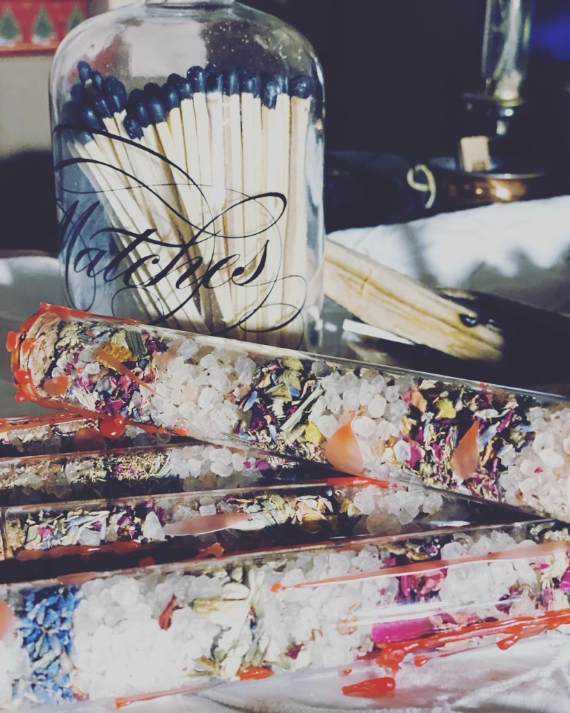 My shop is my hobby and it for the most part covers the cost and any profit I donate it. I have my career so I am grateful for all the opportunities i already have. My smoke-bundles I love to create as I use the moon-phases, I use my garden and I gather my herbs as they call out to me and that is how I create each smoke bundle. I cleanse each of them and spend a huge amount of time with them in nature as i need the smoke-bundles to absorb the earths magic as my own. I have not created any lately, and will begin that magic again this month but I need to feel what calls to me and it’s meaning will be for these next few months. I cleanse every night and use many different types of tools. I will use incense, resin incense, smoke-bundles, palo santo and floral magic. I love to use my cauldron outdoors and under a full-moon, I tend to stay up late as I need to be in solitude when I create my own manifestations and mantras. I am a person who needs a lot of alone time, need to be in nature and internal solitude. Though, for many years till into my 40’s I was surrounded by people, I was escaping with noise.
